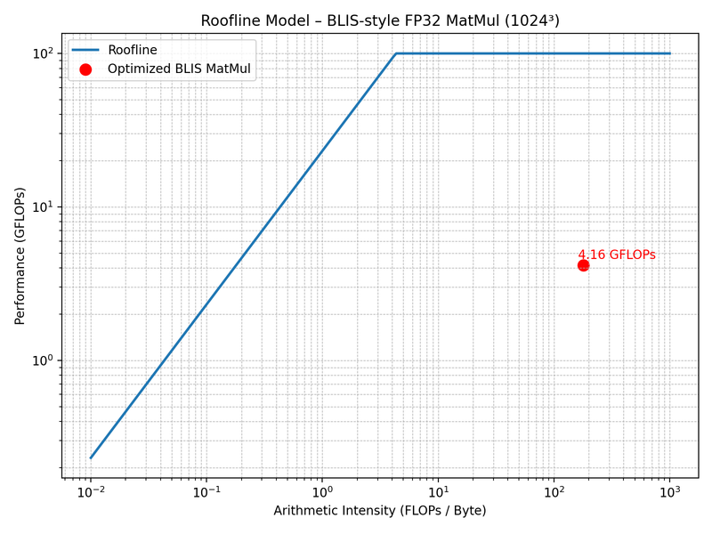 | CPU | BLIS style optimized | ~4.16 GFLOPs | ~6.1x | Packed panels and microkernel |