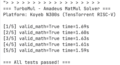 High-performance MatMul solver for Amadeus uPoW. Achieves 2043 solutions/sec on N300s RISC-V with float32 optimization. 100% valid_math=True verified on testnet API.