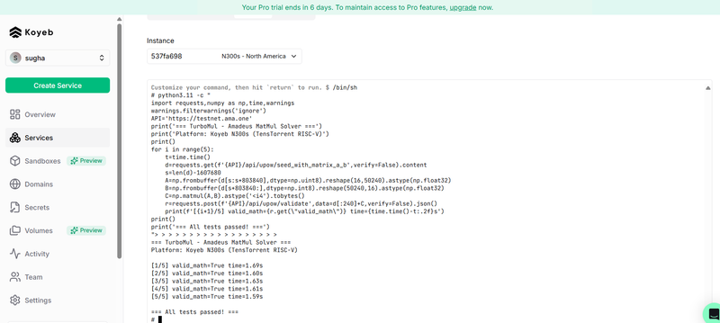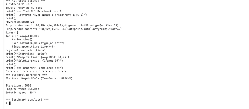 Technical Stack: Python 3.11, NumPy BLAS, Blake3, Koyeb N300s TensTorrent RISC-V, Docker