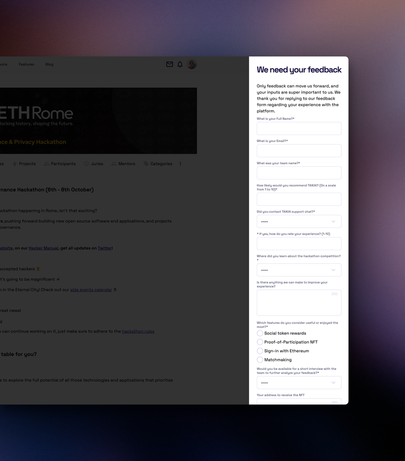 Another update to the new version is the display of a feedback form at the end of hackathons. This form allows participants, organizers, juries, and mentors to leave their feedback and improvement suggestions for TAIKAI’s development team. This valuable input will help us continuously enhance the platform and incorporate requested features.