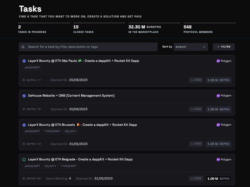 When organizations publish tasks that need to be completed on the Marketplace, builders can submit their proposals to solve those tasks and earn the associated rewards paid in $BEPRO.