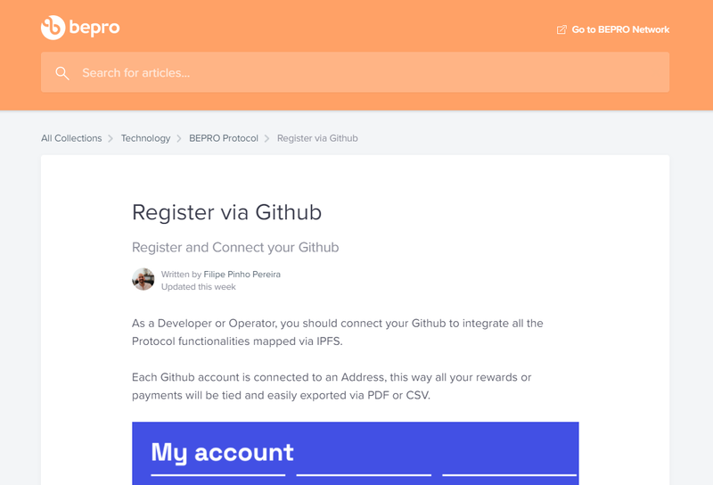 Step 3: Register via Github. To do so, head to https://support.bepro.network/en/articles/5585850-register-via-github (read the article, follow and do the steps).