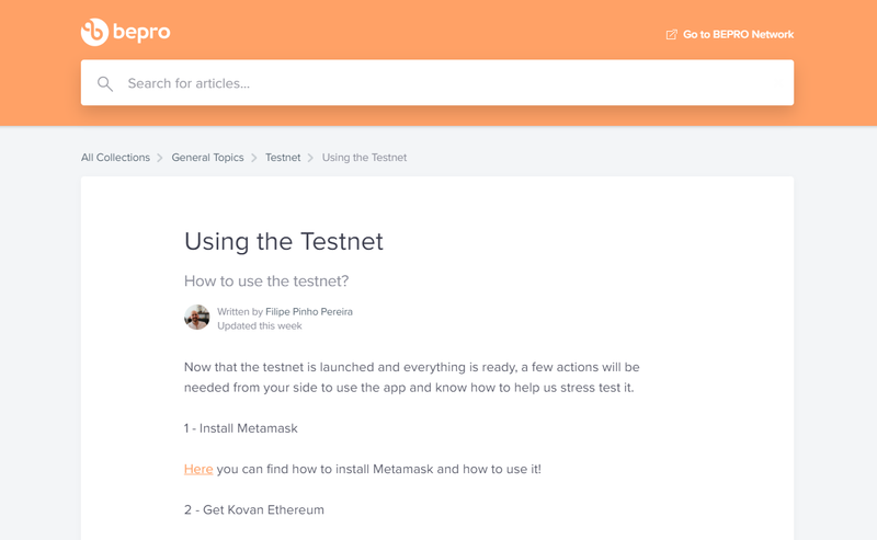 Step 2: Click “Get Started” on the top right menu bar to go here: https://support.bepro.network/en/articles/5595864-using-the-testnet (read the article, follow and do the steps).