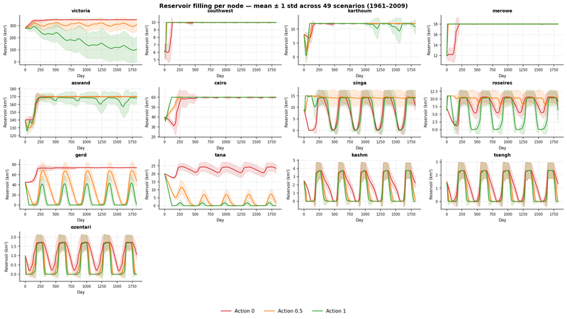 The riversystem simulation engine models daily water flows through the entire basin. For every day in a scenario it computes reservoir storage, hydropower generation, downstream releases, irrigation delivery, drinking water supply, and spillage at each node. The physics are grounded in real data: 70 years of historical discharge records, ERA5 climate reanalysis from the EU Copernicus programme and satellite-derived evaporation estimates. The engine runs in milliseconds, fast enough to power interactive state-of-the-art optimisation algorithms and machine learning techniques.