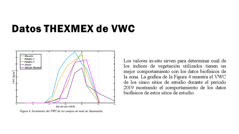 Aprovechando la información obtenida del sitio se pretende buscar índices de vegetación o parámetros satelitales que brinden información más cercana a los datos in-situ que permitan predecir el comportamiento de estos campos bajo ciertas condiciones esto con el fin de tomar decisiones que puedan mejorar el rendimiento de los cultivos y tener una mayor sustentabilidad de los campos lo cual creara un mayor beneficio para los agricultores y para la zona.