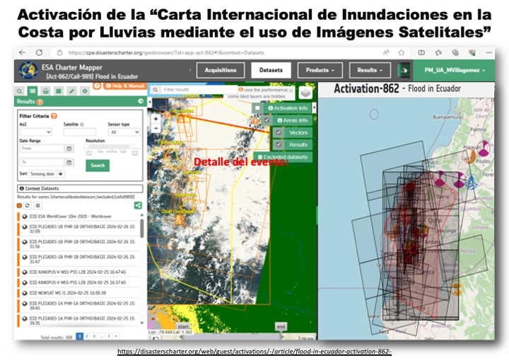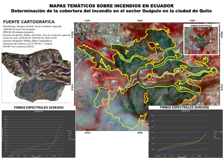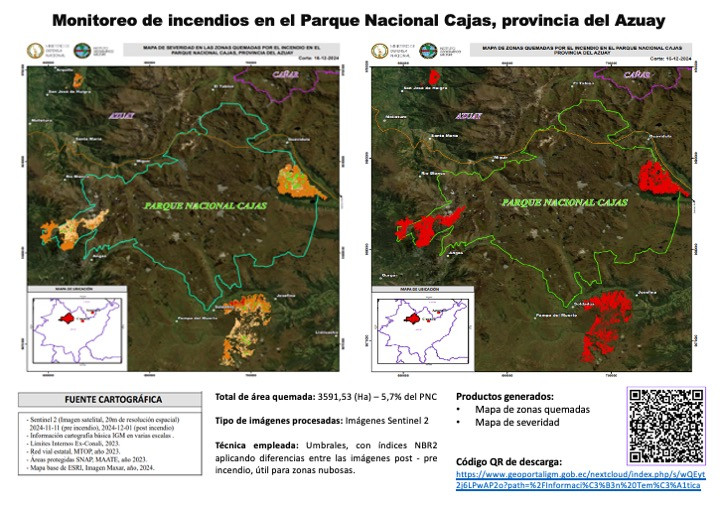 Asimismo, se ha dado apoyo a las autoridades locales para el monitoreo y detección de puntos calientes y zonas quemadas. Casos de estudio: Incendio en el Distrito Metropolitano de Quito y Parque Nacional Cajas.