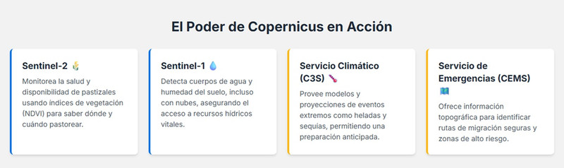 - Imágenes satelitales Sentinel-2 (óptico multiespectral) del programa Copernicus: Para el monitoreo de la salud y disponibilidad de pastizales (cálculo de índices de vegetación como NDVI) y la detección de cambios en la cobertura terrestre.