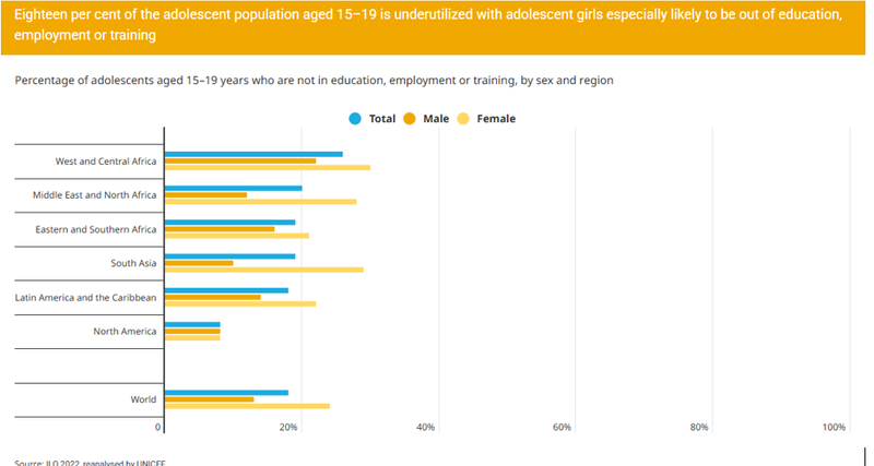 The global NEET (Not in Employment, Education or Training) rate exposes a gender inequality: 28.1% of young women are neither studying nor working, nearly twice the 13.1% among young men.