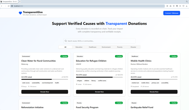 TransparentGive is a decentralized platform for transparent and verifiable donations, built on the Polkadot blockchain.