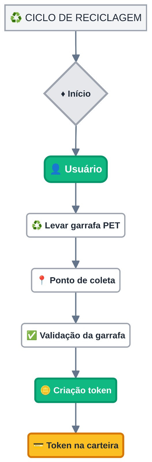 O processo funcionará da seguinte forma: o usuário leva suas garrafas plásticas para um ponto de coleta, onde cada uma será registrada via blockchain, gerando o direito de mintar um token em sua carteira digital.