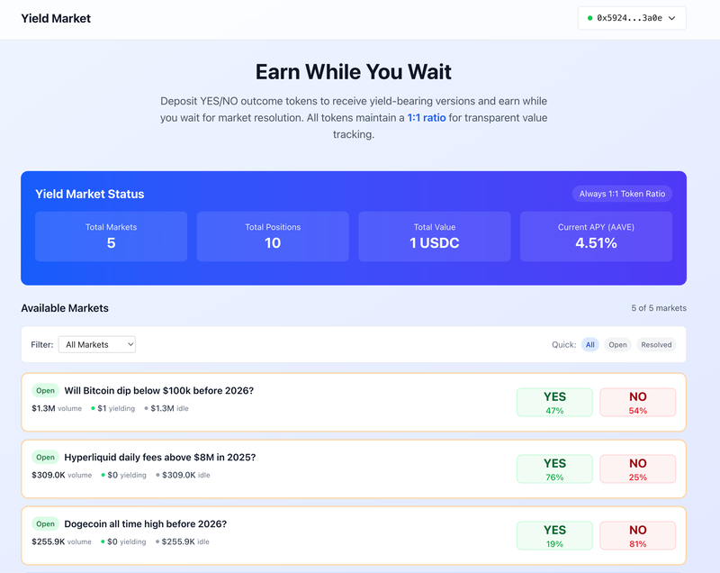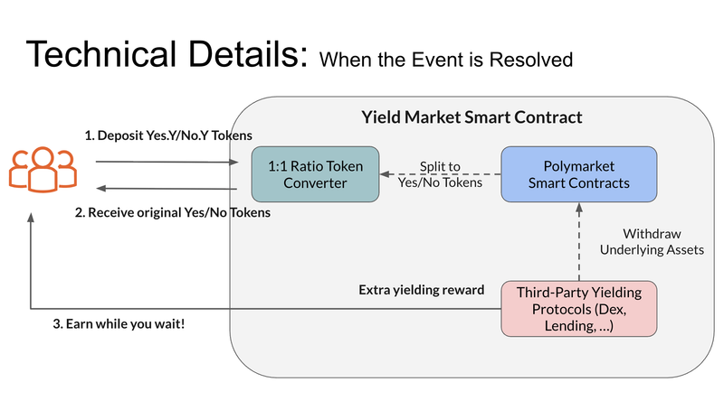 - After market resolution, distributing both principal and accrued yield to the holders of the winning side (YES or NO), based on the outcome from Polymarket.