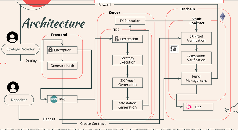 A decentralized trading system that executes encrypted strategies inside Trusted Execution Environments (TEE), ensuring strategy confidentiality while maintaining verifiable execution through Zero-Knowledge Proofs.