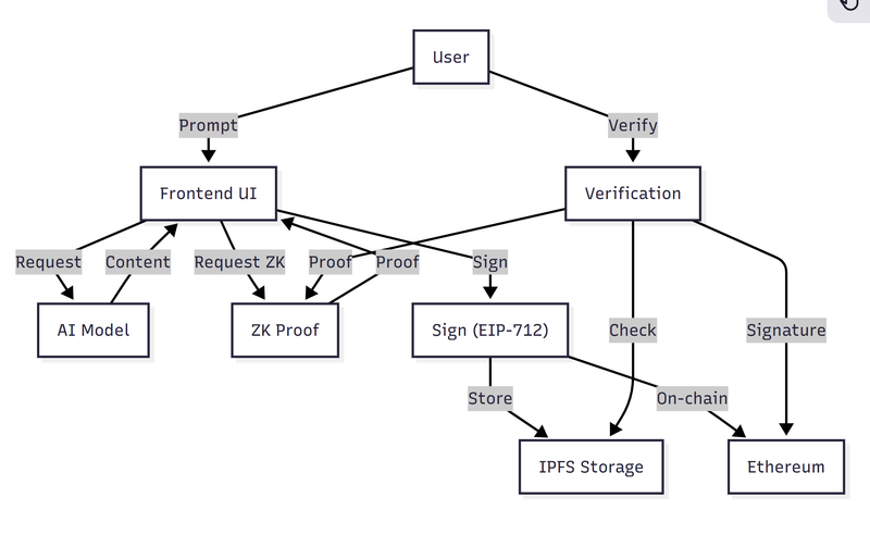 It combines Next.js frontend, Ethereum wallet signing, RISC Zero ZK circuits, and IPFS content-addressable storage to make AI content verifiable, tamper-evident, and transparent. This helps combat misinformation, deepfakes, and plagiarism while preserving privacy.