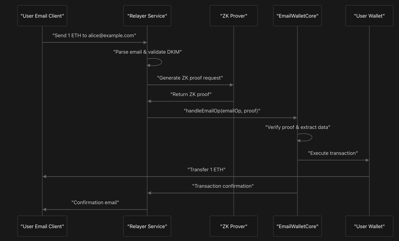 A sender funds an email address; the recipient simply replies to claim. Our relayer verifies email authenticity with DKIM + zkEmail proofs, then executes on-chain actions and, if needed, deploys a deterministic smart wallet. Email addresses stay off-chain for privacy; only commitments and events (e.g., AccountCreated) are on-chain.