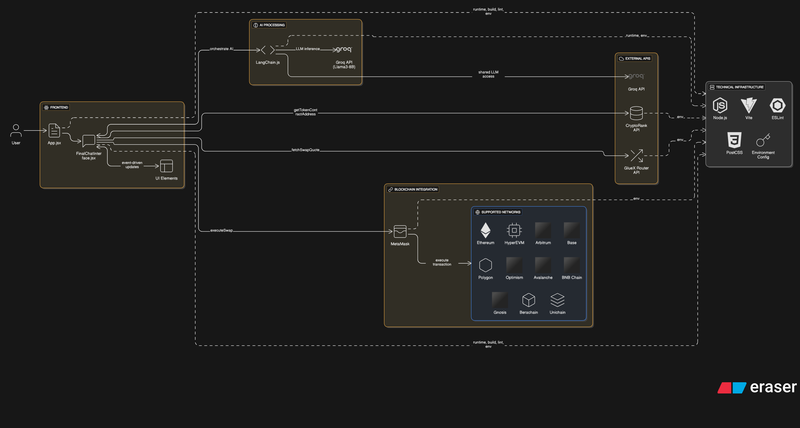 AI-Powered Natural Language Processing: The application leverages LangChain integrated with Groq's lightning-fast Llama3-8B model to parse user intent from natural language. Our custom-trained prompt engineering enables the AI to extract swap parameters (token symbols, amounts, target chains) from conversational text with high accuracy.