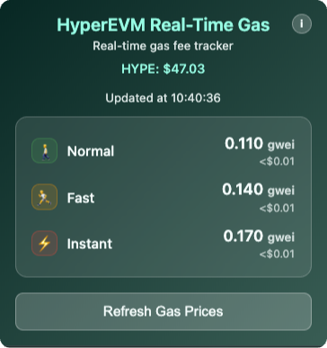 - Real-time Gas Prices: Live gas price tracking from HyperEVM network
