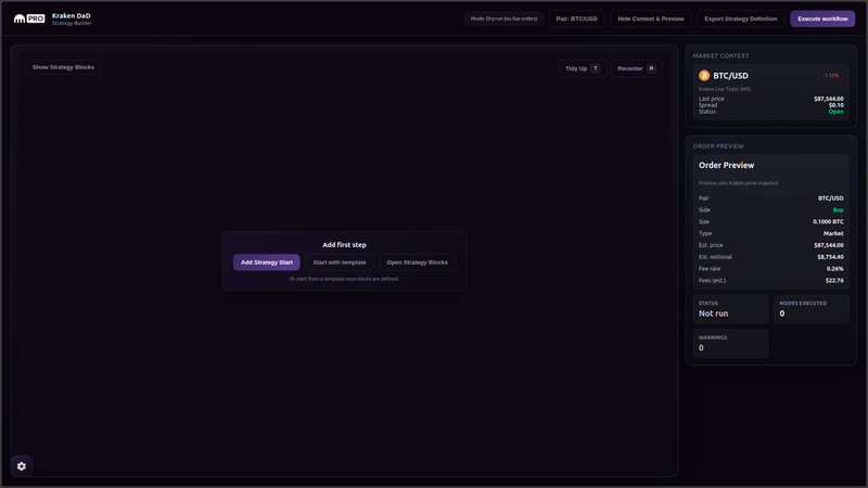 Kraken DaD (Drag-and-Drop) is a professional-grade visual strategy composer built specifically for the Kraken ecosystem. Inspired by the logic-flow architecture of Node-RED and the high-performance aesthetic of Kraken Pro, it enables traders to visually chain market data, technical indicators, and execution intents into robust trading workflows. The platform features a unique Directed Acyclic Graph (DAG) execution engine that ensures deterministic logic, a real-time "Market Context" dock for live monitoring, and a rigorous dry-run system that leverages Kraken's native validation API to guarantee safety.