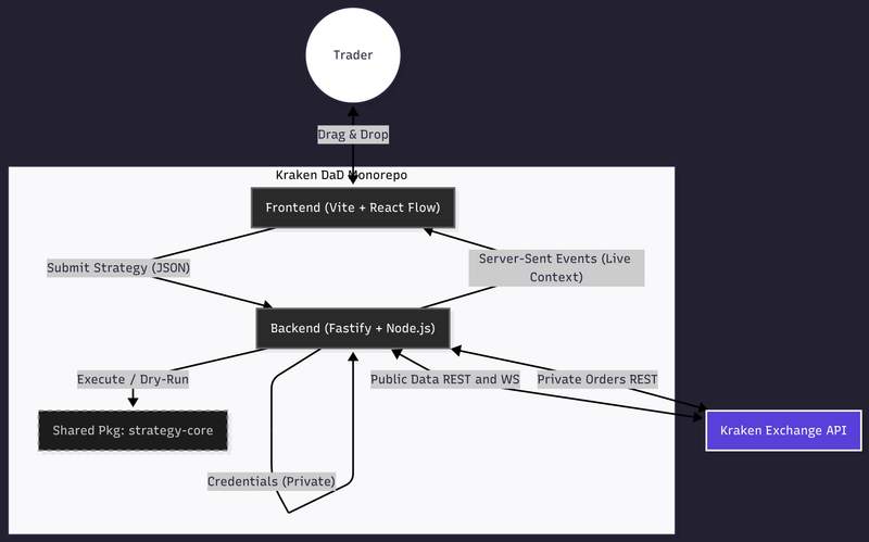 Kraken DaD is built with a modern TypeScript Monorepo stack (Fastify backend, Vite + React frontend) chosen for high performance and strict type safety. A key engineering decision was the implementation of a Topological Sort execution model, ensuring that data dependencies are resolved sequentially before logic nodes execute. Instead of traditional client-side WebSocket management, we implemented a backend-driven Server-Sent Events (SSE) stream to provide a lightweight, unidirectional "Market Context" that reduces frontend complexity. For security, we designed an in-memory credential handler that ensures API keys never touch the browser, maintaining a production-ready security posture.