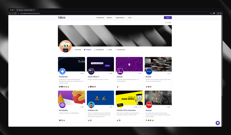 Le profil de l’utilisateur sur TAIKAI peut également servir de portfolio, car il permet de lister des liens vers les réseaux sociaux, l'expérience professionnelle, l'éducation et une biographie. Il inclut même un historique de vos projets et des preuves de participation lors de hackathons passés, en faisant une vitrine convaincante de vos compétences et réalisations.